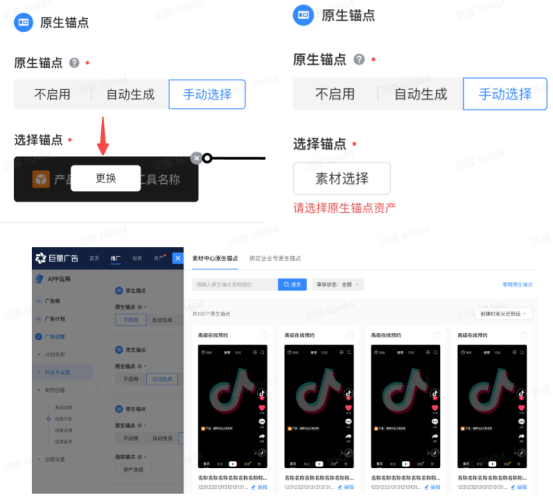 自动生成:将基于您填写的创意设置信息生成样式,您可以直观在【创意预览】窗口查看;(注:应用下载、线索均可支持)。 手动选择:您将可以直接选择【素材中心】中自己原创建好的“锚点样式”直接使用,一次仅可选择一款。(注:应用下载的场景,线索均可支持) 锚点管理 当您在「手动选择」环节做锚点筛选更换,或者选择「素材选择」,可跳转到锚点管理位置【素材中心】 如何做原生广告锚点设置和管理? 路径:导航栏 -- 》素材 -- 》素材中心 -- 》素材管理 -- 》原生锚点 点击新建锚点,即可针对需要推广的内容,进行锚点配置。填写内容涵盖:工具类型、工具名称、工具页面配置等四大模块信息。