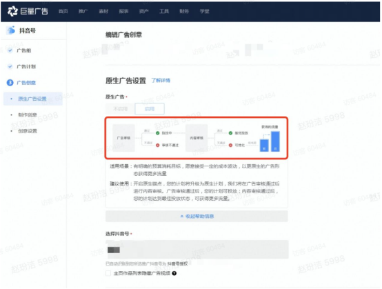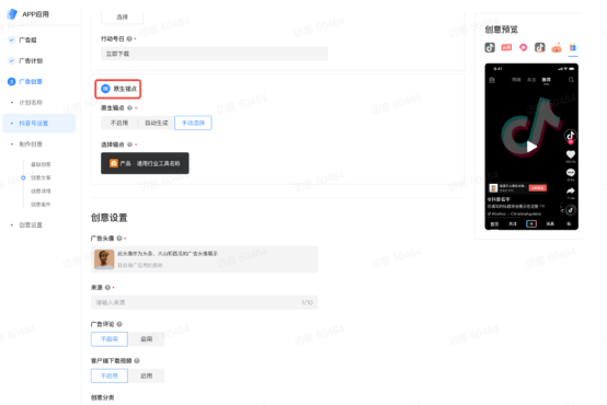 巨量引擎新版「原生广告」亮点优势有哪些? 原生广告在原版状态下可以投放多类型流量,但设置单一,无法并存投放。为满足更多客户在广告营销场景的丰富诉求,巨量广告平台「原生广告设置」能力升级可将支持“锚点组件”提升广告转化跑量,提升更多自然内容分发潜在流量,达到更好的效果。 功能使用路径 ❤️ 首先登陆:巨量广告❤️ 3.1入口:创编链路--》完成广告组、广告计划创建--》广告创意--》原生广告设置 创编设置 前置完成「抖音号设置」操作,完成“素材中心”锚点创建。